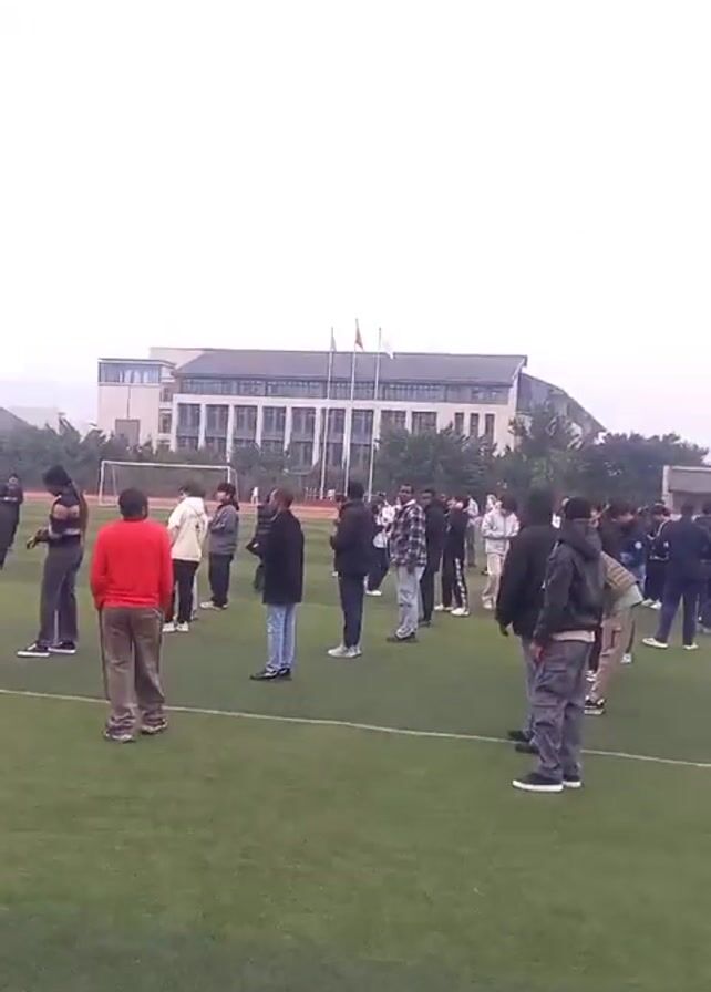 large group of people standing on a green turf field. The field appears to be part of a larger sports complex, possibly a university or school, as evidenced by the building in the background. Some people are talking and looking around, while others seem to be listening to someone out of frame. The sky is overcast and the weather seems cool. The camera pans around the field, showing the different individuals and the surrounding environment.