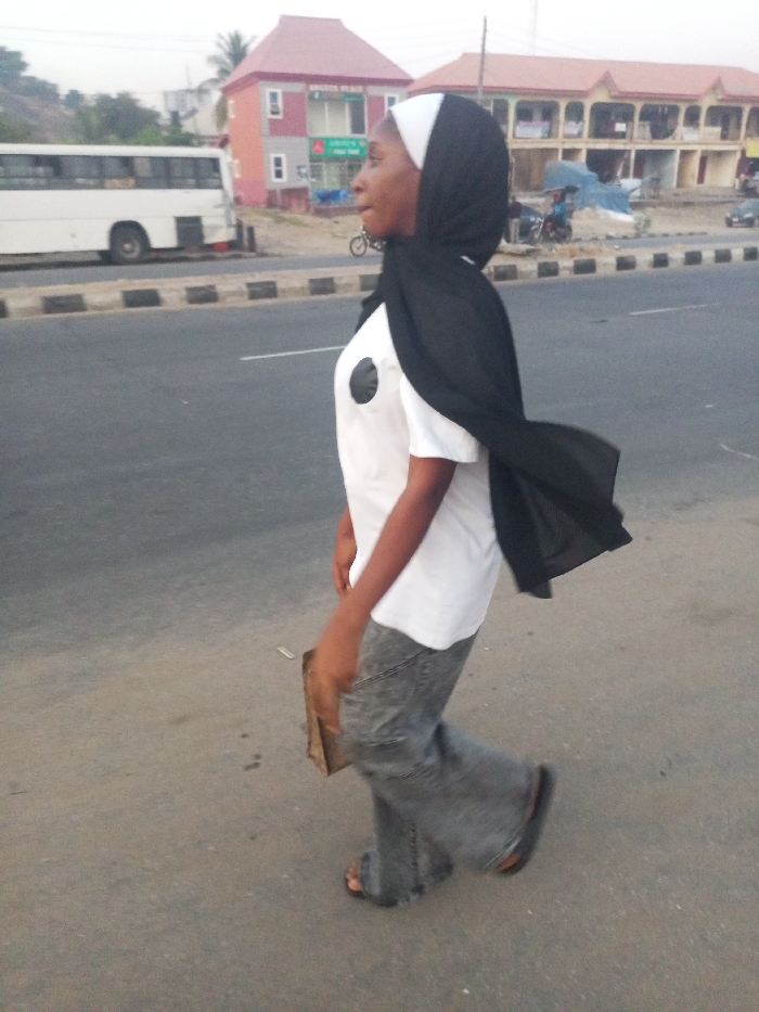 A woman walks on a street, wearing a black hijab, white shirt with a dark circle, and gray jeans