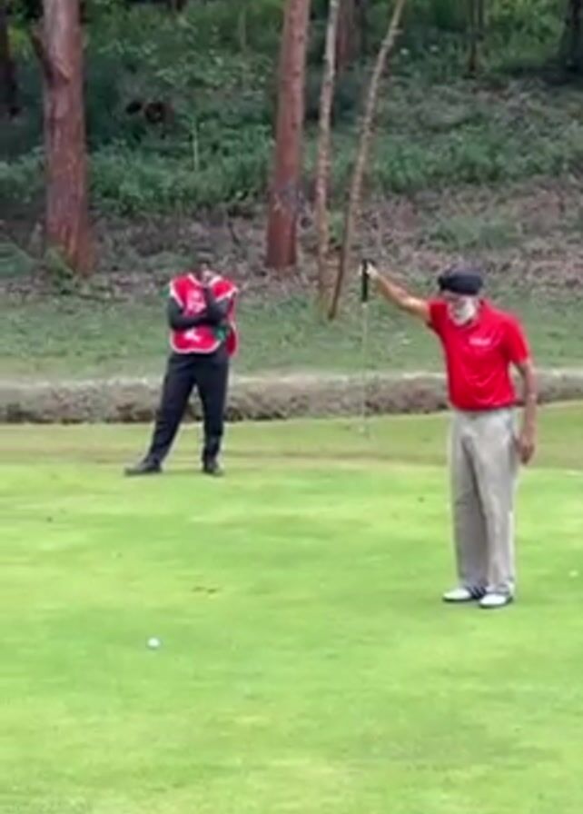 On a verdant golf course flanked by trees, a man dressed in a red shirt, khaki pants, and white shoes stands poised on the green. He is holding a golf club aloft, seemingly gauging the distance. Adjacent to him, a person in a red vest and black pants watches attentively. A golf ball rests on the grass near the man. The camera then pans over the green to a white flag marking the hole in the distance.