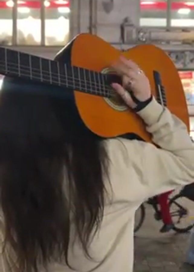person playing an orange classical guitar in an urban setting at night. The guitarist has long, dark hair and is wearing a light-colored long-sleeved shirt. The guitar is being played in the shoulder-carry position, with the person's fingers visible as they strum the strings. The background features a cobblestone street, buildings with lit windows, and pedestrians walking by. A bicycle is also visible in the background. The overall lighting is dim, with artificial lights illuminating the scene. The focus is primarily on the guitarist and the guitar, with the background appearing slightly blurred.