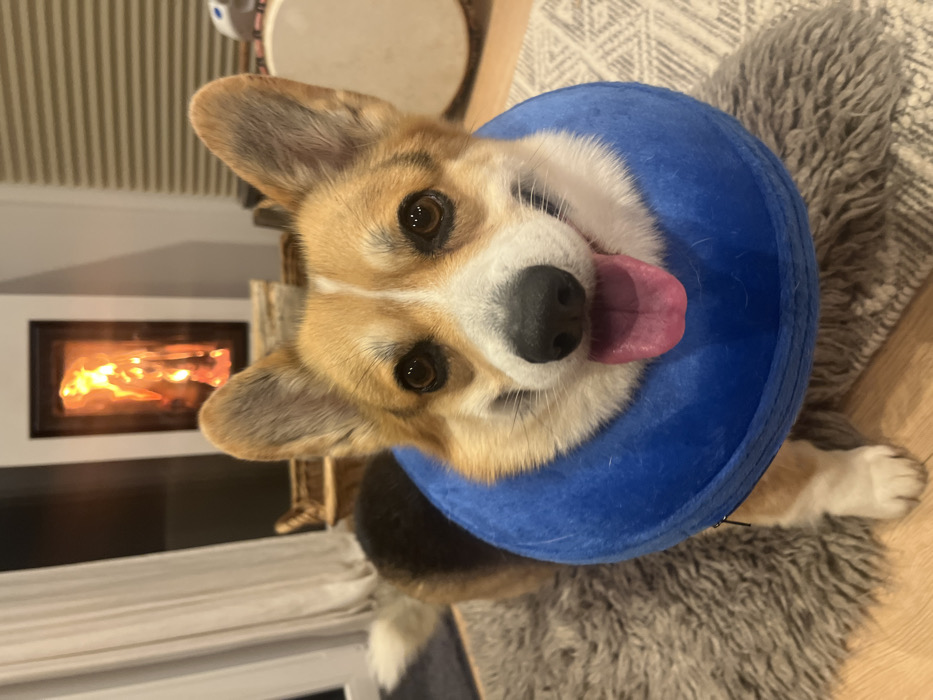 The image depicts a Pembroke Welsh Corgi dog, distinguished by its tricolor fur of white, tan, and black, standing on a light brown shag rug. The dog is positioned centrally, facing the camera, with its mouth open and a pink tongue extended. It is wearing a prominent blue, inflatable protective collar around its neck. In the background, a modern fireplace with a visible fire and burning logs is active. To the right of the fireplace, a white djembe drum with a natural-colored skin head rests on a patterned rug. A woven basket is partially visible behind the dog's left side. Light-colored wooden flooring is visible, and to the left, a window covered by light-colored curtains is present. The scene is an interior room, specifically identified as being in Gangloff, Germany. No people are visible, and no interactions between subjects are depicted beyond the dog's gaze towards the viewer.
