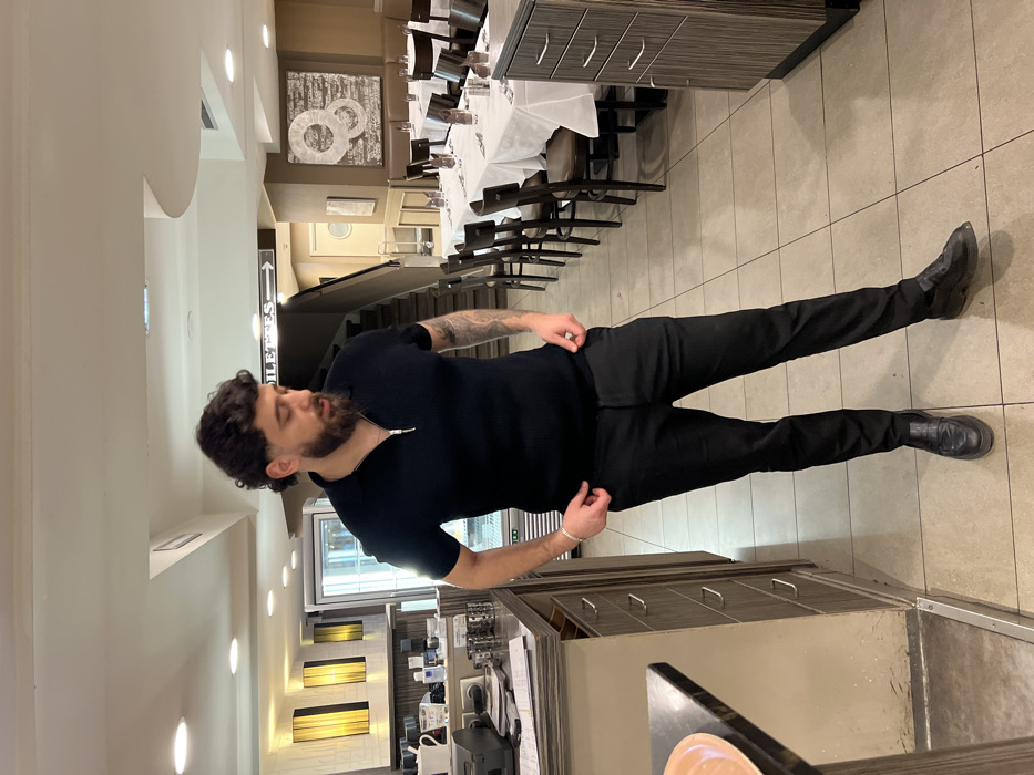 The scene depicts the interior of a restaurant or dining establishment. An adult male stands centrally in the foreground. He has dark, curly hair, a full dark beard, and visible tattoos on his left forearm. He wears a black short-sleeved ribbed polo shirt with a silver zipper at the neckline, black trousers, black slip-on loafers, a silver-colored chain necklace, and a silver-colored bracelet on his right wrist. His hands are positioned near his waistband/pockets, and he is looking downwards and slightly to his left. To the man's left is a service counter with a dark countertop and light wood-paneled cabinets featuring silver handles. A white mug and various small items are arranged on the counter, behind which a commercial beverage refrigerator is visible. A light orange plate is partially visible on the far left edge of the counter. In the mid-ground and background, a dining area is arranged with multiple tables draped in white tablecloths, each set with dark wooden chairs, glassware, and condiments. Another cabinet unit, matching the style of the service counter, is positioned on the right side of the dining area. A staircase with dark treads ascends in the mid-background. Above the staircase, a sign indicates "TOILETTES" (French for restrooms) with a directional arrow pointing to the right. An abstract art piece with silver circular designs against a darker background hangs on the wall to the right of the stairs. The ceiling is white with recessed lighting, and the floor is composed of light-colored square tiles. While the "TOILETTES" sign confirms a French-speaking region, there are no specific visual identifiers within the image to confirm the location as Strasbourg, France.