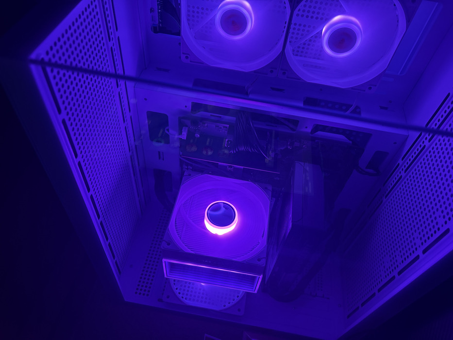 The scene is located in the city of Stefan Karadja, Bulgaria. The image depicts the interior of a white computer tower case, illuminated by internal purple LED lighting. A dark environment surrounds the illuminated case. Within the case, multiple components are visible: - A large CPU air cooler is centrally positioned on the left, featuring a fan with a glowing purple hub and blades. - To the left of the CPU cooler, a single exhaust fan, also glowing purple, is mounted at the rear of the case. - A large graphics card, dark in color, is installed horizontally beneath the CPU cooler, partially obscured. - On the right side, two vertically stacked intake fans with white frames and glowing purple hubs and blades are visible at the front of the case. - Portions of a motherboard are discernible between the CPU cooler and the front intake fans, with various dark cables connected. - The top and bottom panels of the case consist of white perforated metal mesh. - A clear, reflective side panel, likely tempered glass, is partially visible on the right, reflecting some internal light. No individuals or direct interactions are visible. The computer components appear powered on, actively emitting purple light.