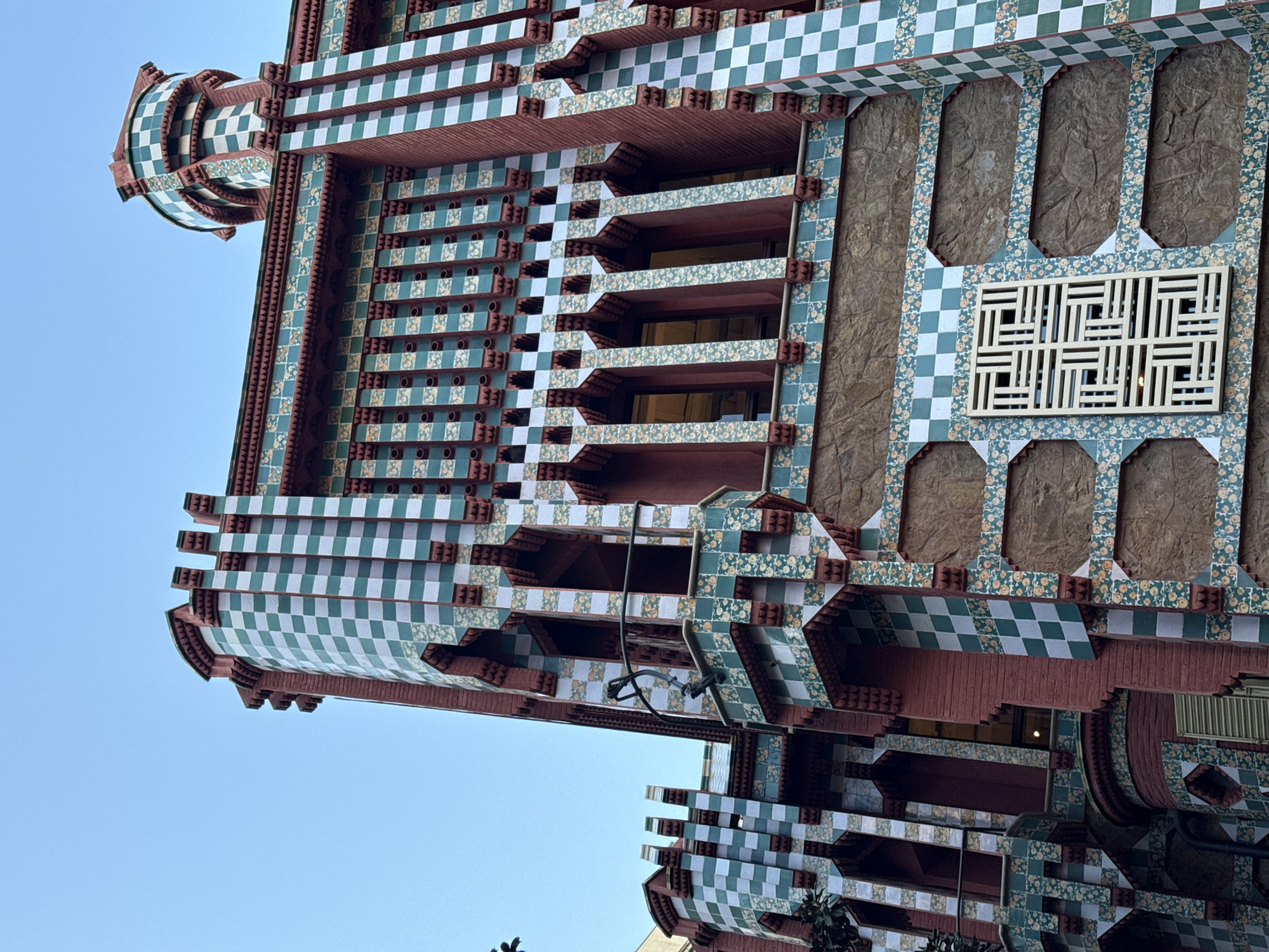 The image depicts the exterior of Casa Vicens, a building in Barcelona, Spain designed by Antoni Gaudí
