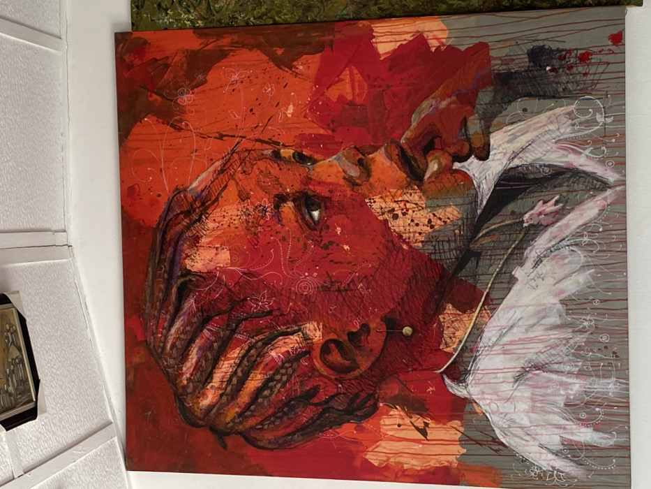 A large, vertically oriented mixed-media painting depicting a child in profile from the chest up is centered in the frame, situated within an interior location in Ikate, Nigeria