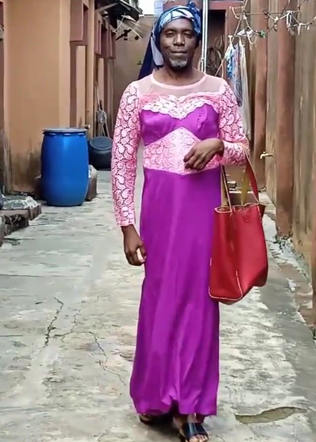 A person is walking towards the camera in a narrow outdoor corridor. The person is wearing a long, bright purple dress with pink lace sleeves and bodice, a blue headscarf, and dark sandals. They are carrying a large red tote bag. The corridor is between two buildings of a light brown color, and the ground is cracked concrete. A blue barrel and other objects are visible in the background. The person is smiling slightly.