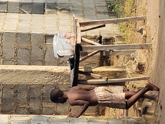 This image depicts an outdoor scene in Adonkolo, Nigeria. A young male, exhibiting dark skin and short dark hair, is positioned in the left foreground, facing left with his back to the viewer. He is shirtless, wearing patterned shorts that extend to his knees, and light brown sandals. His left hand is resting against a light gray concrete block wall, and his legs are crossed at the ankles. In the central mid-ground, a rudimentary wooden table stands, supporting a clear plastic container with a lid, which holds numerous small, light brown, spherical objects (consistent with eggs). A dark object rests adjacent to the container on the table. The background features various concrete block walls, some appearing weathered, and a dirt ground with sparse dry vegetation on the right.