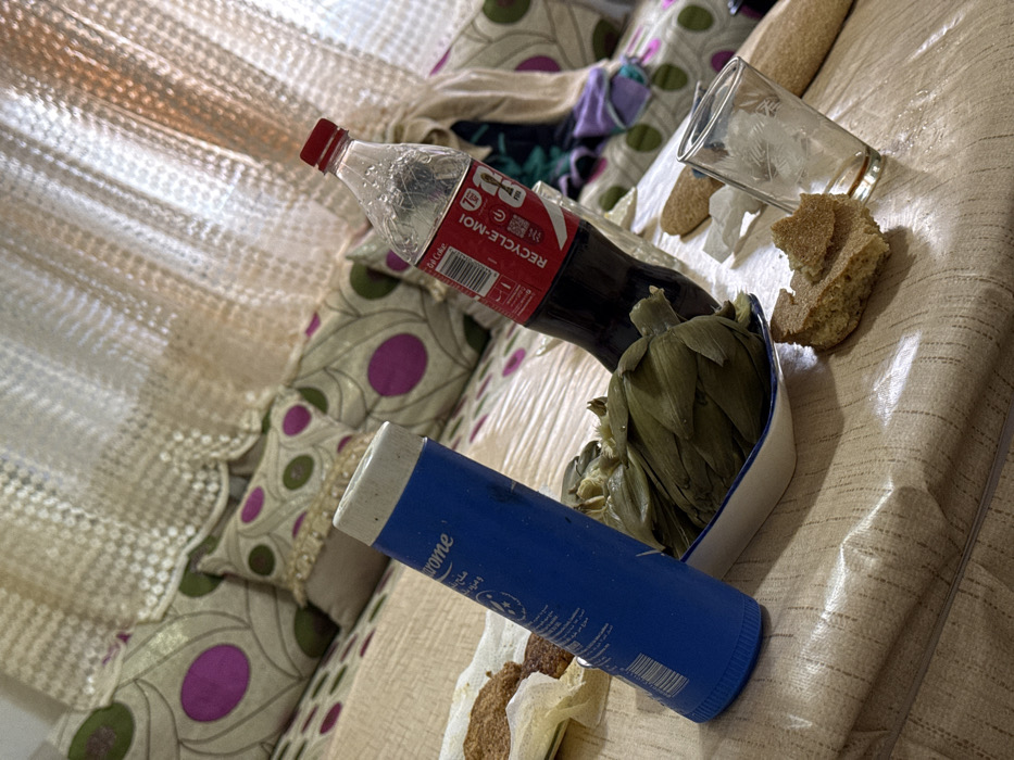 The image depicts an indoor scene within a residence in Salé, Morocco. A light-colored, patterned fabric surface, likely a tablecloth or floor covering, serves as the primary plane. Arranged on this surface, from left to right, are: - Partially obscured food items, possibly pastries or fritters, resting on white paper. - A tall, blue cylindrical container with a white top, featuring "arome" and Arabic text on its label. - A white rectangular dish with a blue rim, containing several cooked green artichokes. - A partially consumed, clear plastic bottle of Coca-Cola with a red screw cap. The label displays "RECYCLE-MOI" and other text. - A fragmented piece of light brown, crumbly baked good, possibly bread or cake. - An empty, clear glass tumbler. - Scattered crumbs and a small piece of crumpled white paper are visible near the glass and baked good. - On the far right, a cylindrical, light brown object, possibly another bread item, is partially visible. The background reveals a seating area furnished with multiple cushions. These cushions exhibit a light fabric base with a repeating pattern of olive green and magenta concentric circles or spirals. Behind the cushions, a sheer, light-colored lace curtain with a repeating geometric pattern is visible, suggesting a window. Various folded fabrics, including a dark blue item and a purple cloth, are present on the cushions to the right. No individuals are present in the scene, which indicates a recent or ongoing informal meal or snack.