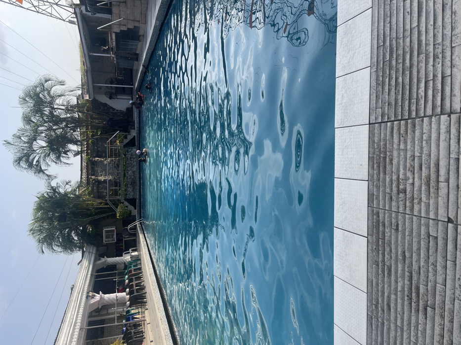 This image depicts an outdoor swimming pool facility located in Animashawun, Nigeria, under a clear, bright sky