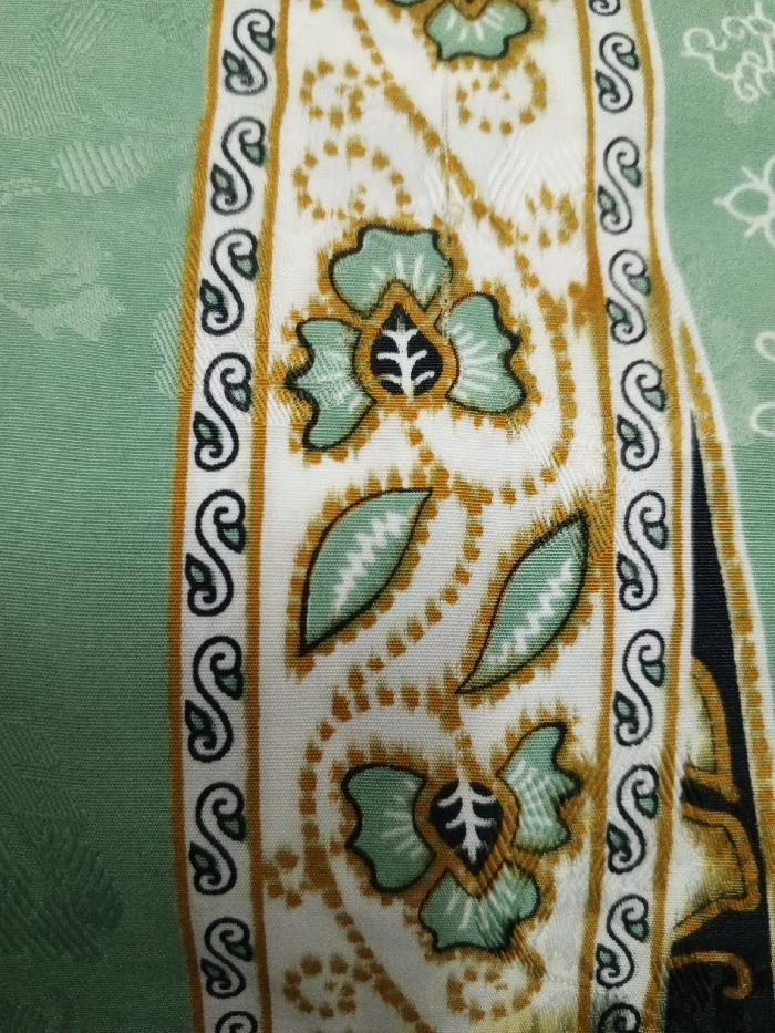 This is a close-up image of fabric with a decorative pattern. A wide, white strip features floral motifs in shades of green, black and brown. Leaf shapes and flower-like elements are distributed along the white background, highlighted by brown dots. The edges of the strip are bordered by a band of repeated S-shaped figures in black, nestled between thin brown stripes. The fabric to the left of the white strip has a subtle, textured green pattern.