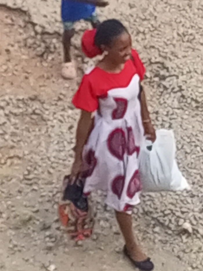 In the city of Zango-ndaji, Nigeria, a daylight scene depicts two individuals on an unpaved, gravelly ground surface. In the foreground, an adult female with dark skin walks rightward, a slight smile on her face. She wears a white knee-length dress featuring large, irregular dark red patterns and red puffed sleeves with a red collar section. A red head covering or hair accessory is visible. She carries a multi-colored bag in her left hand and wears dark flat shoes. To her immediate right, a white plastic bag rests on the ground. Partially visible in the upper left background is a child, wearing a blue shirt and light-colored footwear, standing or walking behind the woman.