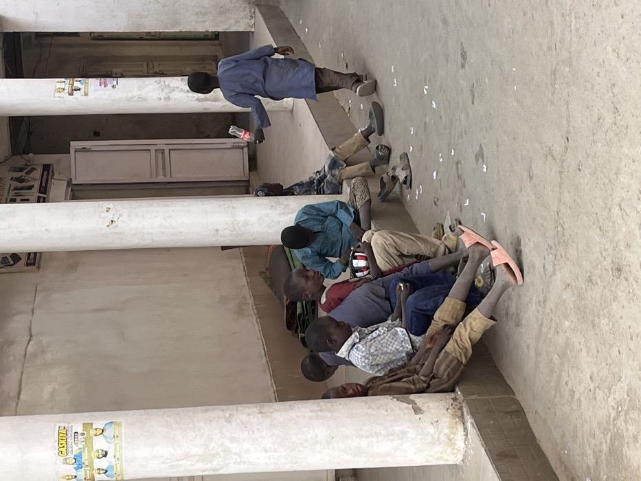 The scene depicts an outdoor area in Fagge A, Nigeria, characterized by a light-colored building wall and a concrete or dirt ground
