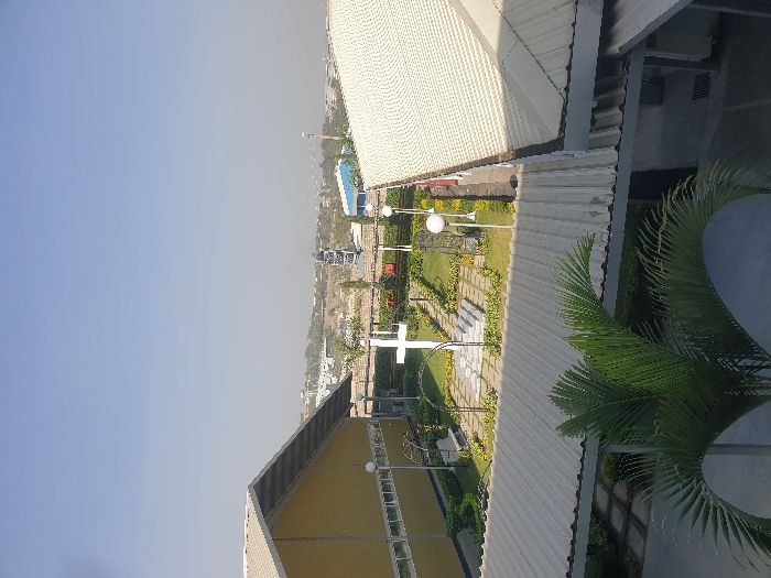 An elevated view reveals a landscaped garden featuring paved walkways, manicured lawns, and globe streetlights. The scene is framed by architectural elements including rooftops and a palm tree. In the distance, a tower-like structure rises above the surrounding urban area, set against a clear, light sky.