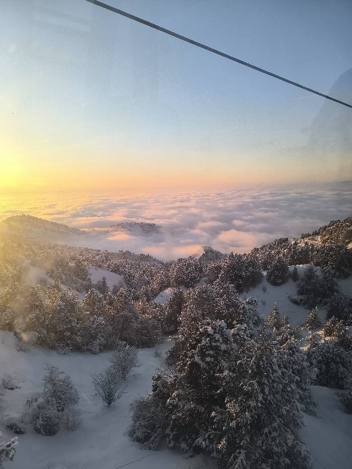An aerial view captures the snowy landscape of the Amirsay ski resort in Uzbekistan during sunrise or sunset. The upper sky displays a gradient from a bright golden-orange on the left horizon, transitioning to soft peach and then clear blue at the top right. A wide cloud inversion forms a dense, white, horizontal layer across the mid-ground, resembling a sea of clouds, with warm golden and pink hues reflected from the sun. Below and partially emerging from this cloud layer are snow-covered mountain slopes densely populated with evergreen trees, their branches laden with white snow. Patches of deep snow cover the ground, revealing varied terrain with smaller, snow-dusted bushes in the foreground. A thin, dark cable traverses diagonally across the upper portion of the sky, extending from the upper-left to the upper-right of the frame. No individuals, actions, or interactions are visible.