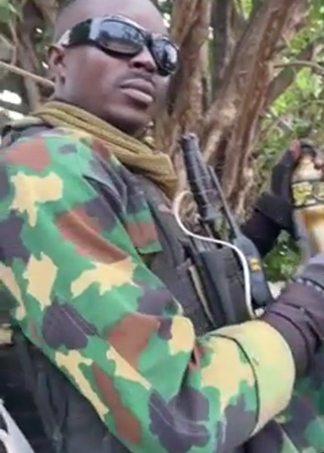 A person in military camouflage clothing is shown in an outdoor setting. The individual is wearing sunglasses and has what appears to be a headset attached. They are seated next to a large piece of military equipment, possibly a mounted weapon system, which has a cap with a red star placed on it. The person is holding a bottle of liquid and appears to be drinking from it. The background shows trees and greenery, suggesting the scene is in a wooded or rural area.