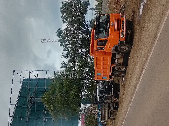 The scene is a roadside area in Nanyuki, Kenya, under an overcast grey sky. Two large dump trucks are parked on a muddy dirt shoulder alongside an asphalt road. In the foreground, an orange FAW dump truck (license plate KDD 380R) is positioned facing right, featuring an orange cab and an orange dump bed with prominent blue-painted panels on its sides. Behind it, a black Isuzu dump truck (license plate KDD 301D) is also parked, partially obscured, facing the same direction. Both trucks appear to be six-wheel, three-axle vehicles. To the left, a large, multi-panel billboard frame with green panels is partially visible behind dense green trees. Further back and to the right, a tall, slender lattice-structure cell tower extends into the sky, also surrounded by trees. The ground immediately adjacent to the road is unpaved, consisting of dirt and mud with several small puddles. In the background, beyond the parked vehicles, there are indications of undeveloped or construction land, including piles of loose earth or aggregate. No human figures are present or discernible in the image.