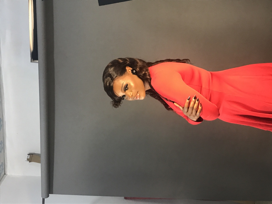 A woman in a red dress stands against a gray backdrop. Her dark hair is styled with waves and a curled fringe. She looks off to the side with a slight smile. Her arms are crossed, and her hands are visible, revealing long, dark nails. The left side of the frame shows a white wall with a vertical gray bar or column. Overall, the scene appears to be a studio setting, likely for a photoshoot.