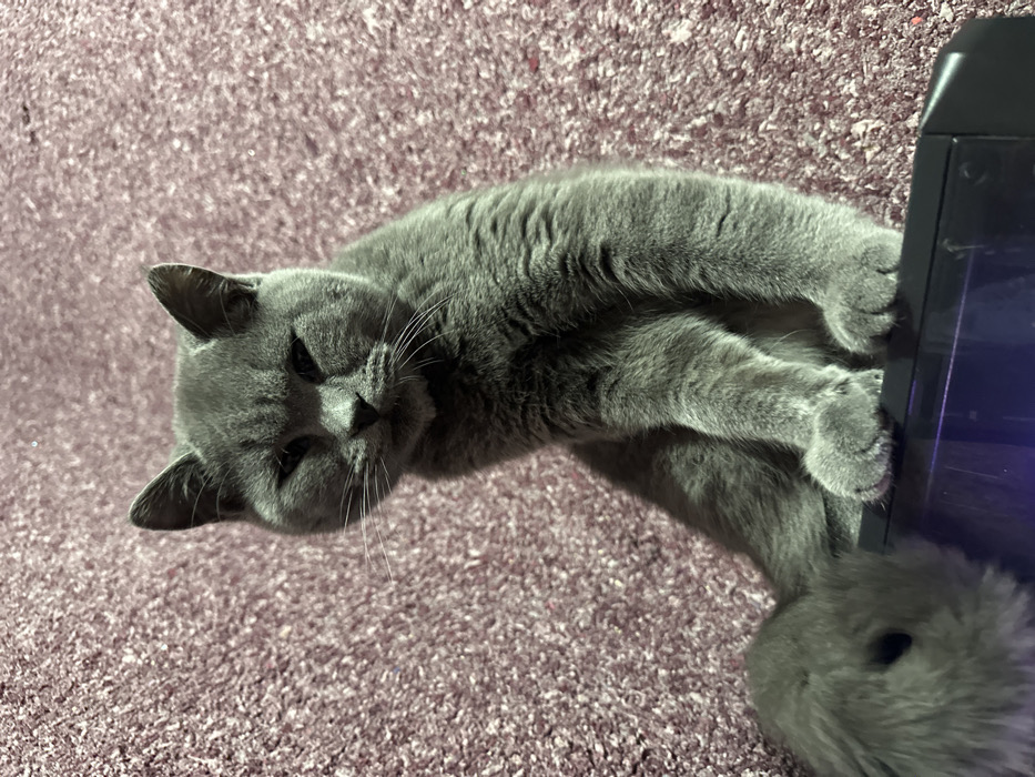 A gray cat rests on a plush, textured surface, possibly carpet. The cat's head is slightly tilted towards the viewer, with eyes partially closed, displaying a relaxed demeanor. Its paws are positioned near the edge of a dark, possibly electronic device. The tail is curled beside the device. The lighting casts shadows, enhancing the contours of the cat's fur and the texture of the carpet.
