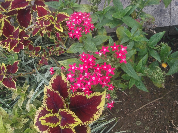 The image presents a detailed, close-up view of a vibrant garden scene located in Pacet, Indonesia. The primary subjects are various plant species arranged in a dense cluster. Prominently featured are Coleus plants (Plectranthus scutellarioides) with large, dark red leaves bordered by irregular, bright yellow-green margins, visible in the upper left and distributed throughout the upper and middle portions. Central to the composition are multiple clusters of small, five-petaled, fuchsia-pink flowers with tiny white centers, consistent with Pentas lanceolata (Egyptian Starcluster). Interspersed among these are slender, strap-like green leaves, likely belonging to an ornamental grass variety. The lower left section of the frame consists of dark brown soil, while a grey concrete or stone border is visible along the right edge and partially at the bottom right. A small, ovoid, yellow object, possibly a fallen fruit or seed, rests on the soil near the bottom center. No human figures or animal life are present, and no specific actions or interactions are depicted beyond the static arrangement of the flora within the garden environment.