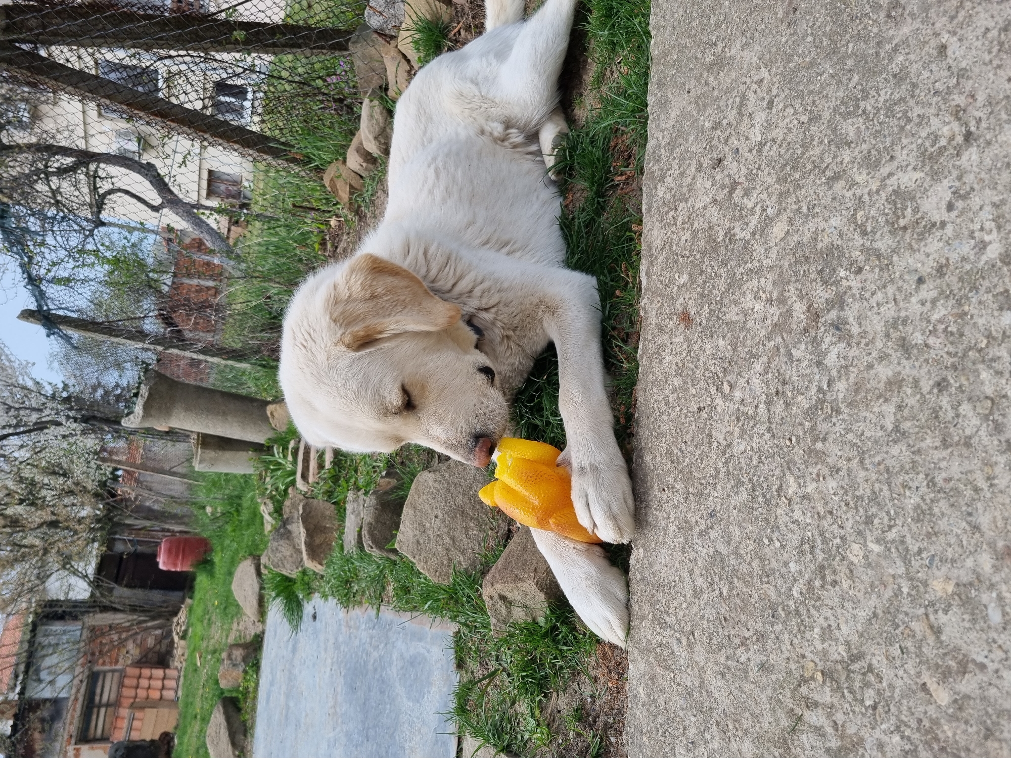 A dog with light fur lies on grass next to a concrete surface. It is holding a yellow object in its paws and licking it. In the background, there is a grassy area with some concrete structures, a fence, trees, and buildings. The location appears to be Galabovtsi, Bulgaria.