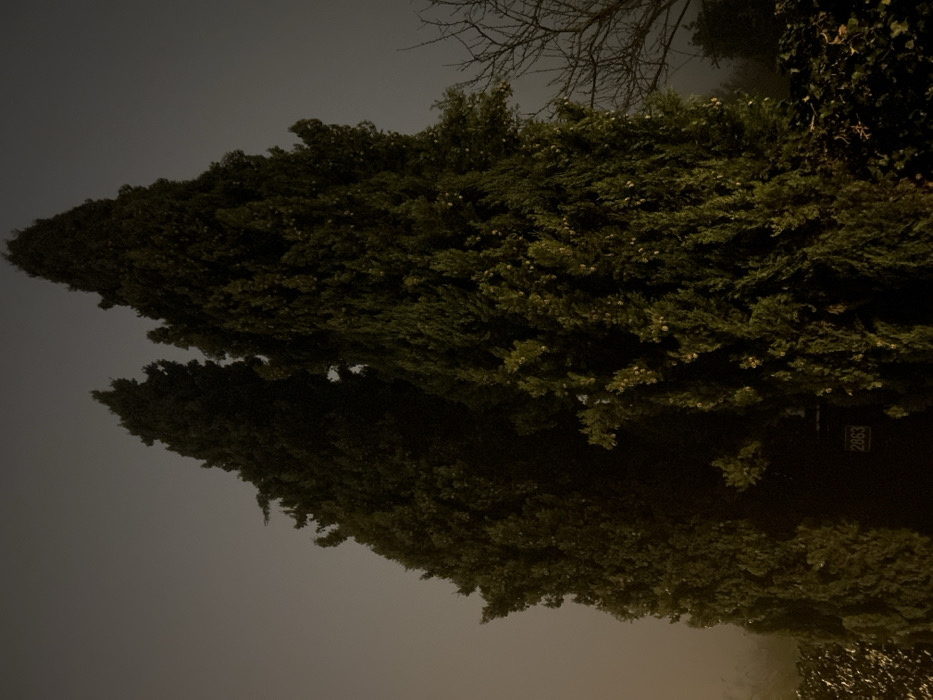 A tall, thick, dark green tree is the primary focus, extending diagonally across the frame. The sky is a uniform, cloudy gray. The right edge of the tree is bordered by additional greenery and a bare tree with thin branches. A house number, "2863," is visible on a dark surface near the right edge. The lighting suggests it's nighttime or a very overcast day. The image is slightly blurred and has a muted color palette.
