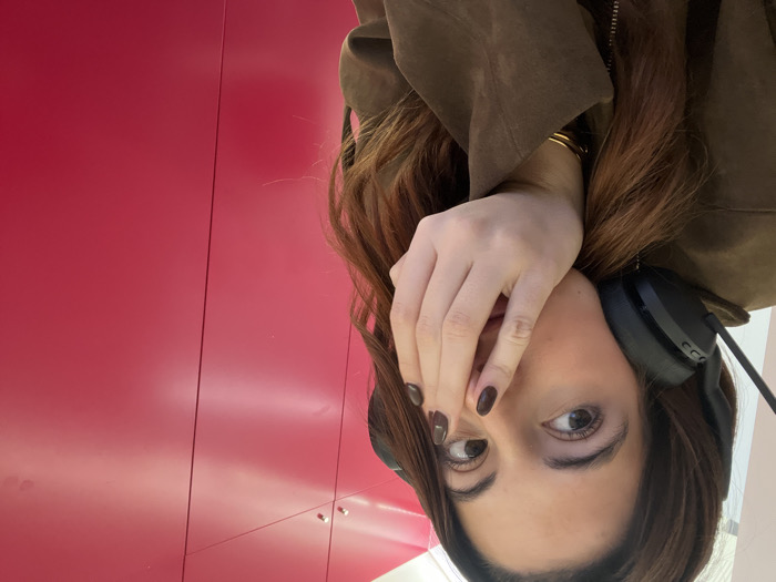 A female individual is depicted in a close-up, chest-up shot. She has long, wavy dark brown hair with lighter undertones. She is wearing a brown or dark beige zippered jacket. Black over-ear headphones, featuring a microphone boom, are positioned on her head, partially obscured by her hair. A gold-toned, double-banded bracelet is visible on her left wrist. Her left hand, with manicured dark brown nails, covers her mouth and lower face. Her right eye gazes directly forward, while her left eye is directed upward and to the left. The background consists of a bright, glossy magenta-red wall, displaying vertical seams suggesting panels or cabinetry. Two small, reflective metallic fixtures are visible near the top left corner of the wall. The scene is set in an indoor location within Porto, Portugal.