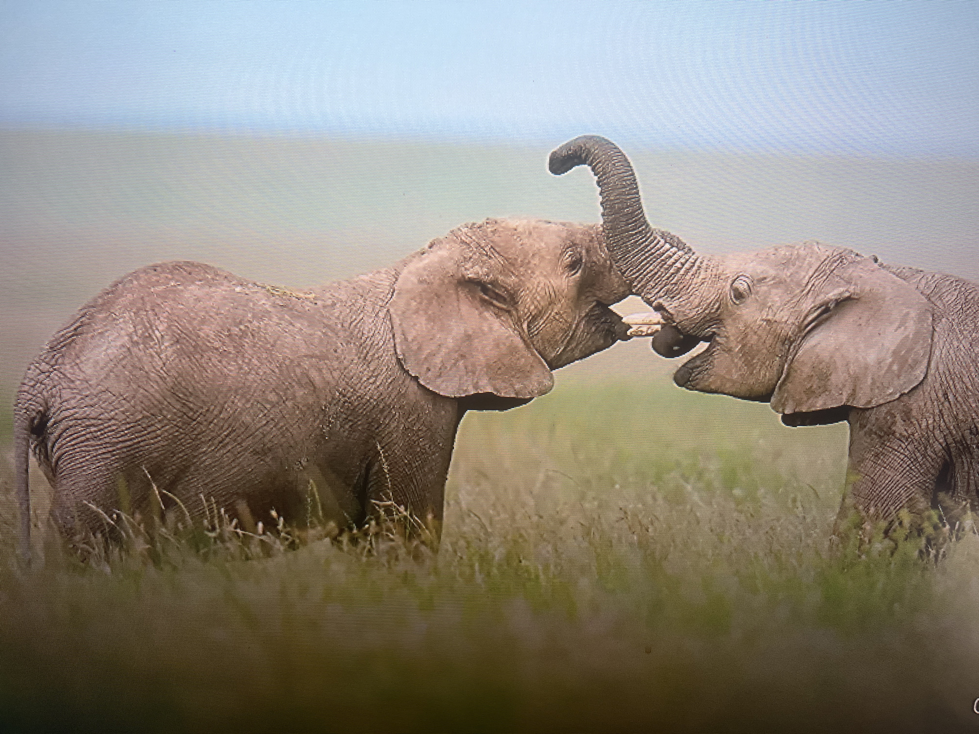 A medium shot displays two African elephants interacting in a natural, open grassland environment. The elephant on the left faces right, exhibiting its left flank and head. The elephant on the right faces left, with its head and upper body visible. Their trunks are raised and appear to be touching or entwined near their faces, suggesting an interaction. Both elephants have wrinkled, gray-brown skin and large ears. The foreground and midground consist of sparse green and light brown grasses. The background features a blurred, light green or tan horizon line beneath a pale blue sky. The image exhibits visible horizontal scan lines and pixelation, indicating it is a photograph of an electronic display. This scene, featuring elephants in a wild or semi-wild habitat, is not located within the city of Vienna, Austria.