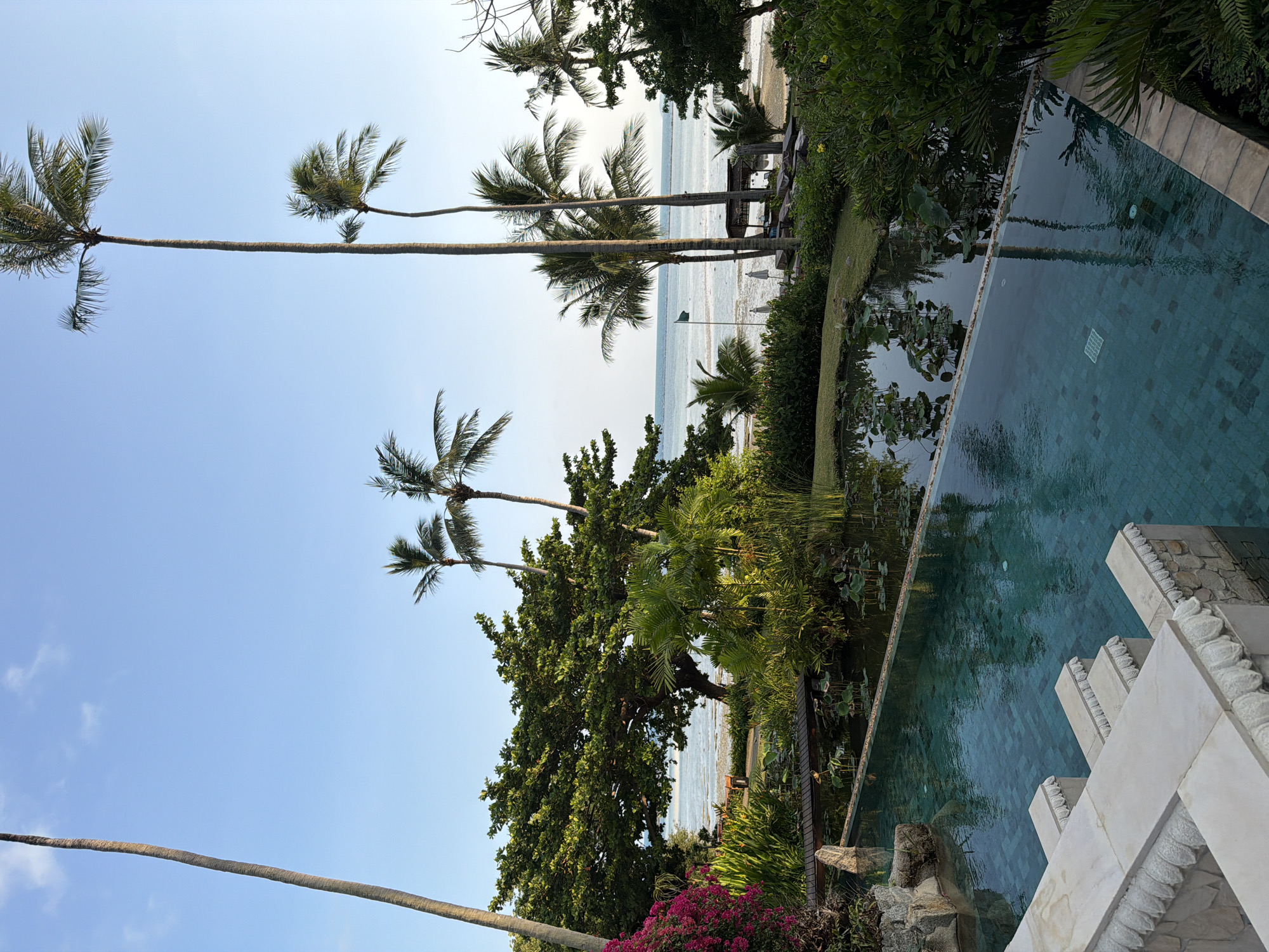 The image displays a tropical coastal scene in Baan Harn, Thailand, under a clear light-blue sky with minimal scattered clouds. In the foreground, white stone steps with ornate carved detailing descend into a rectangular swimming pool tiled in blue and teal squares. To the left of the steps, a rock formation supports vibrant pink bougainvillea. Adjacent to the swimming pool, a dark-water pond is visible, featuring lily pads and aquatic vegetation. A small wooden bridge spans this pond. A dense array of lush green tropical plants and shrubs separates the pool and pond from the beach beyond. In the midground, several tall palm trees with green fronds and a large, full-canopied green tree are prominent. Beyond this vegetation, a sandy beach is visible. On the beach, a green flag is planted near the water, and a thatched-roof shelter is situated to its right, accompanied by multiple beach chairs or loungers and umbrellas. The ocean, displaying light waves, extends to the horizon. No individuals or specific activities are observable. The scene is illuminated by clear daytime natural light.