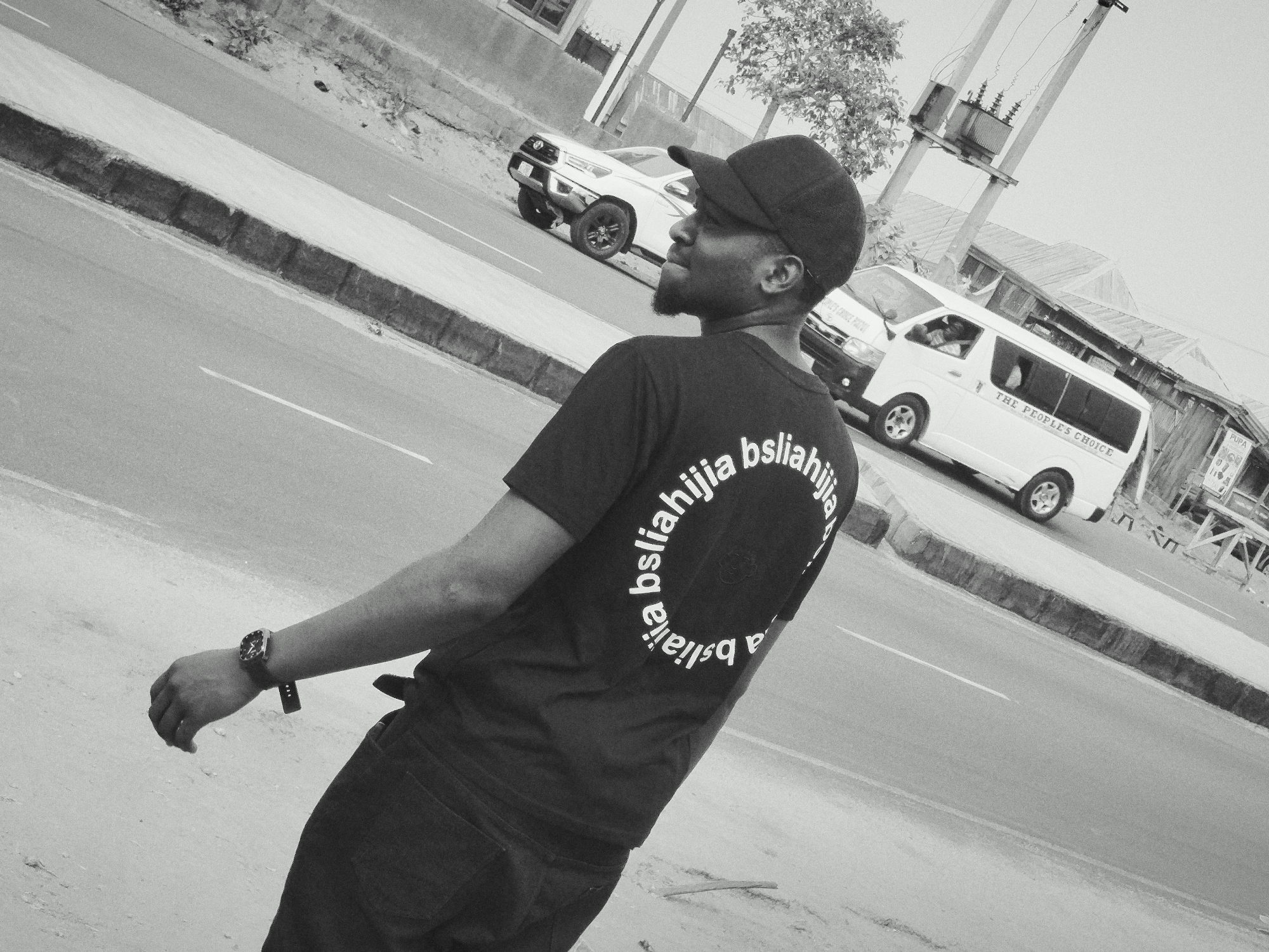The image captures a man standing on a roadside in Keffi, Nigeria. He is wearing a dark T-shirt with the word "bsliahjia" printed around a circle on the back, dark trousers, and a cap. He is glancing over his shoulder to the right. A watch is visible on his left wrist. In the background, vehicles are parked on the road. A white Toyota Hilux is on the left side of the image. A white van with the words "THE PEOPLE'S CHOICE" on its side is also visible. Power lines and utility poles are in the background, alongside buildings and trees. The road has a curb and white lines indicating lanes. The overall tone of the image is monochrome.