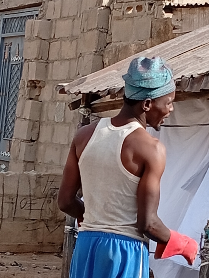 In Gayawa, Nigeria, an adult male stands in profile, facing right. He wears a light-colored sleeveless tank top, blue shorts with a white stripe, and a teal patterned headwrap. His left hand, visible at the lower right, is covered by a bright red glove. His mouth is slightly ajar. Behind him, a corrugated metal roof is visible, along with white fabric, possibly a canopy or curtain, to the right. To the left, a building constructed of light-colored bricks features a window with a dark metal security griller. The ground consists of compacted earth.
