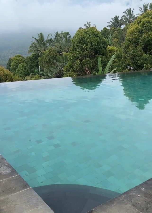 swimming pool with an infinity edge. The pool is tiled in light blue or green squares. The edge of the pool is made of dark gray stone. Beyond the pool is a landscape of trees and mountains under a cloudy sky. There are lounge chairs and an umbrella next to the pool on the right side of the frame. The water is calm, reflecting the sky and trees.