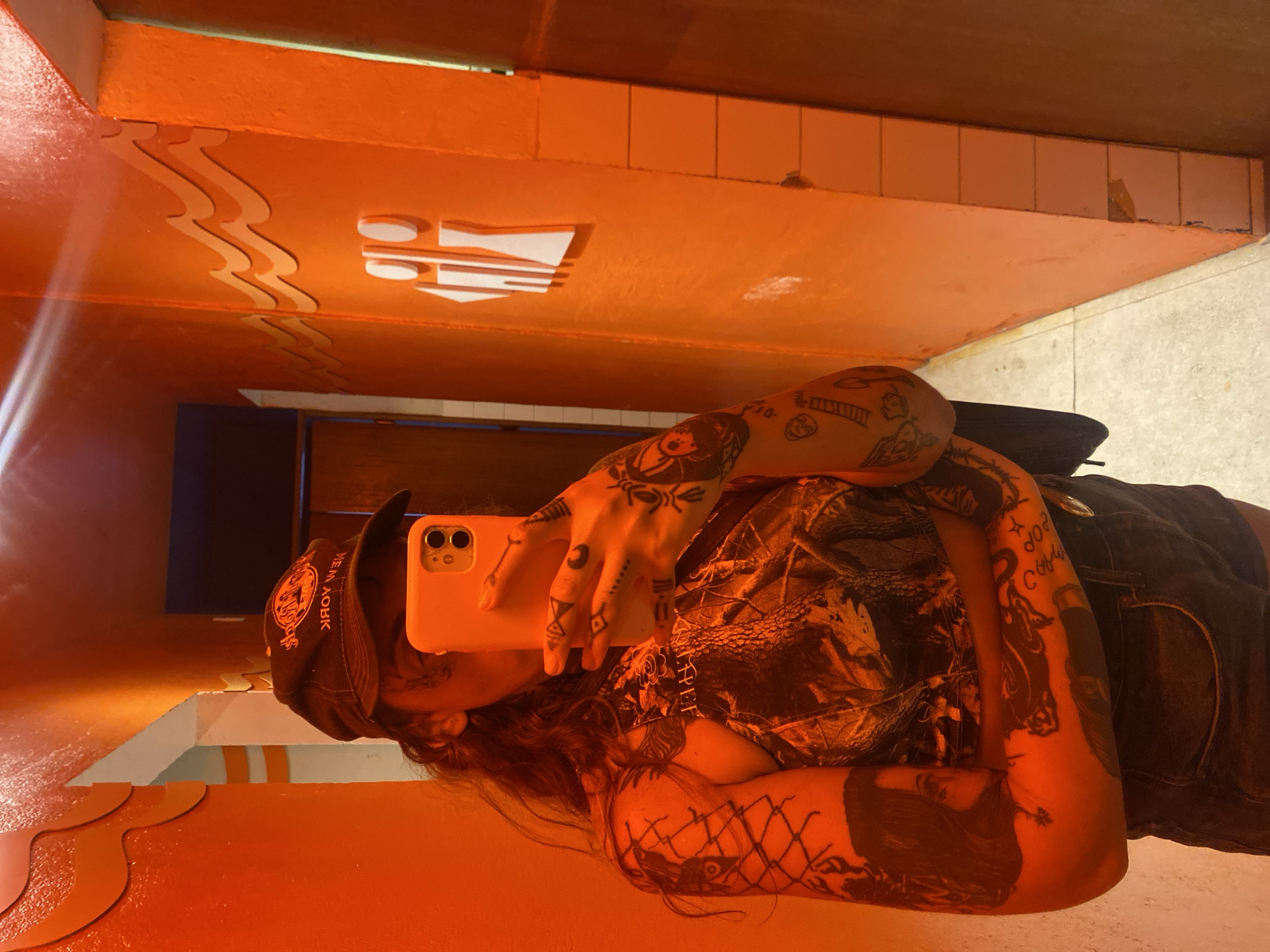 The image depicts a person of indeterminate gender capturing a mirror selfie within what appears to be a public restroom or an adjacent hallway. The environment is characterized by intensely illuminated orange walls. The right wall features raised, white iconography depicting stylized male and female restroom symbols, situated above a lower section of light-colored tiles. Above these symbols and extending across the upper portion of the wall are decorative, undulating wave-like patterns in a lighter orange or white hue. Similar wave patterns are partially visible on the left wall. The floor is light-colored. The individual, whose face is obscured by a light-colored smartphone held in their right hand, is wearing a dark baseball cap with a "HARD ROCK NEW YORK" logo visible in reflection on the front. Long, dark, wavy hair extends from beneath the cap. The subject wears a camouflage-patterned crop top and dark denim shorts. Both arms and hands are extensively covered with various tattoos, including illustrative figures, abstract designs, and symbolic patterns. A dark object, possibly a bag strap or garment, is visible over the left shoulder. The background reveals a darker doorway or passage to the right. Based on the visible "HARD ROCK NEW YORK" logo on the cap and the distinct, themed interior typical of such establishments, the location is inferred to be within the Hard Rock Cafe Rio de Janeiro, likely situated in Barra da Tijuca.