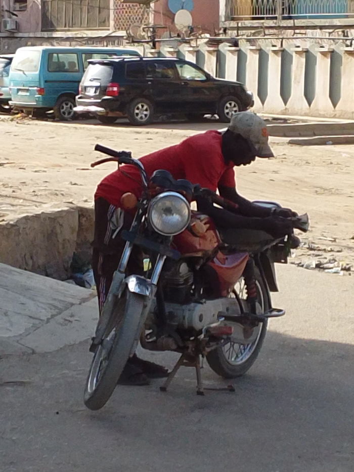 The image depicts an outdoor street scene in Sabon Gari West, Nigeria. In the foreground, a dark-skinned male, wearing a red short-sleeved shirt, dark pants with white stripes, and a light-colored baseball cap worn backward, is positioned over a red and chrome motorcycle. His hands are engaged near the motorcycle's handlebars and engine, suggesting an action of inspection or maintenance. The motorcycle is stationary, supported by a center stand, with its front wheel slightly angled. The ground beneath is a mix of dirt and weathered pavement, with a concrete curb visible to the left. In the mid-ground, a light blue minivan and a dark-colored SUV are parked. The background features a light-colored building adorned with multiple white and blue satellite dishes on its roof, adjacent to a decorative concrete wall characterized by a series of pointed, vertical elements. Daylight illuminates the scene.