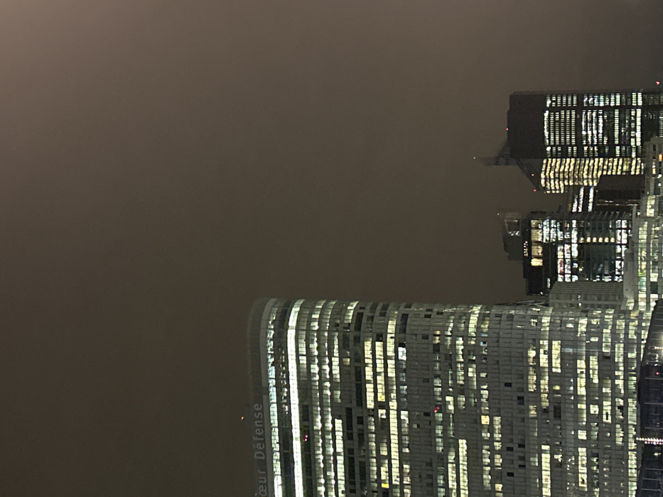 Two modern skyscrapers dominate the right side of the image, illuminated against a dark, hazy sky. Their facades are composed of numerous windows, creating a grid-like pattern of light and shadow. One tower has "Coeur Défense" visible on its lower portion. The dark sky takes up more than half of the scene, suggesting either night or heavy fog.