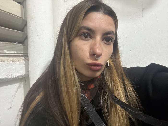 A woman takes a selfie, her face the focal point. She has long, highlighted hair and piercings in her nose and ear. A dark hoodie frames her face. The background is a textured, off-white wall next to what appears to be a window with closed blinds. The lighting is diffused, casting soft shadows.