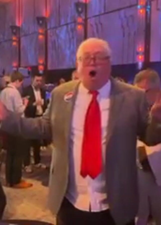 Sure! Here's a description of the video: The video captures a busy indoor scene with a crowd of people gathered in what appears to be a ballroom or event hall. The atmosphere seems lively, with individuals dressed in business and formal attire. The room is decorated with patterned walls and red lighting, adding to the ambiance. At the center of the frame is a man holding a sign that reads "Curtis Sliwa is the spoiler." He is gesturing and speaking loudly, seeming to be making a statement to those around him. Other people in the scene are looking at him, some standing, some sitting. There are also interactions occurring between different groups of people in the background.