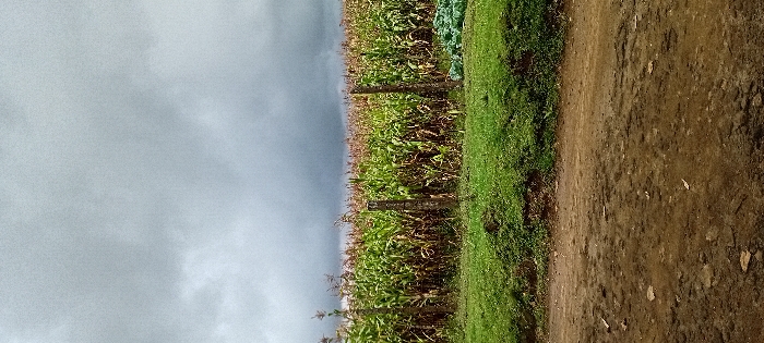 The scene, located in Gatakaine, Kenya, depicts an outdoor rural environment under an overcast sky filled with dark grey clouds. A dense field of mature maize, exhibiting predominantly green foliage with visible brown tassels, occupies the midground and background. A rudimentary fence composed of three weathered wooden posts separates the field from the foreground. Adjacent to the right-most visible fence post, a cluster of green leafy plants, consistent with cabbages, is observed on the ground. The immediate foreground features a damp, uneven dirt path containing small stones and scattered dry leaves. This path is bordered by a raised bank of vibrant green grass.