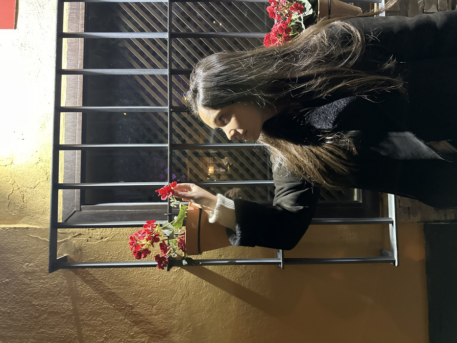 A person with long, dark hair stands next to a window with bars, touching a red flower. The window has a plant with red flowers in a pot on the sill. The person wears a black coat with white cuffs. The wall next to the window is yellow-orange. The image is rotated, with the wall running horizontally across the bottom. The bars on the window are grey and run both horizontally and vertically. The background through the window is dark.