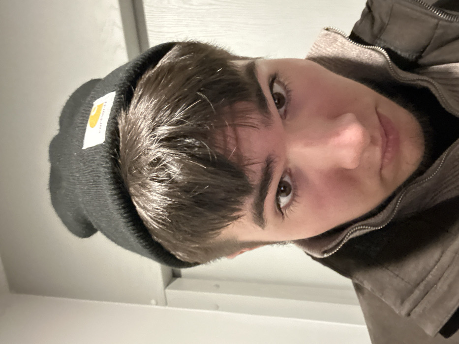 A young adult male is depicted in a close-up, chest-up portrait. He wears a black beanie with a visible white rectangular Carhartt label featuring an orange circular logo. His dark brown hair is visible beneath the beanie. He has light brown eyes and a direct, serious gaze towards the camera. His complexion appears flushed across the cheeks. He is dressed in a dark brown or black jacket over a lighter, ribbed, beige-colored collar. The background is a plain, light-colored interior wall, with a faint vertical seam or door frame visible on the left and a portion of a light-colored door or panel on the right. The scene is located in Lviv, Ukraine.