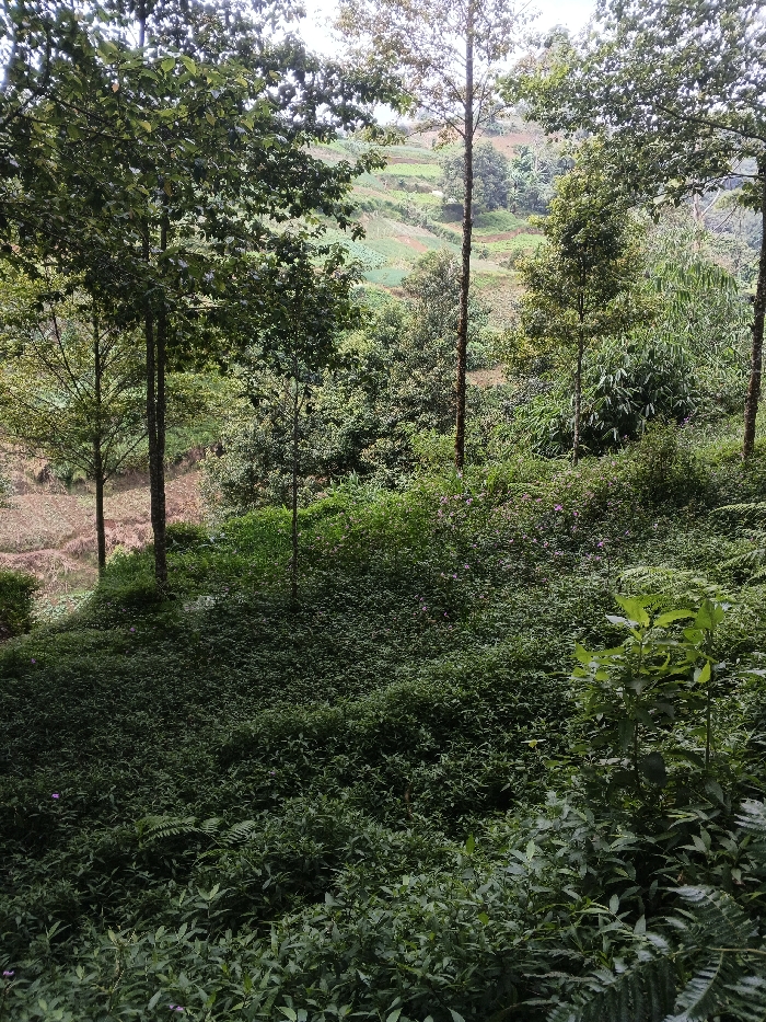 Lush greenery dominates the foreground, filled with ground cover plants and small trees. Taller, slender trees punctuate the scene, reaching into the middle ground. In the background, a hilly landscape with terraced fields is visible, suggesting agricultural use. A scattering of trees and vegetation adds depth to the background. The image evokes a sense of dense foliage and a natural, possibly cultivated, environment.