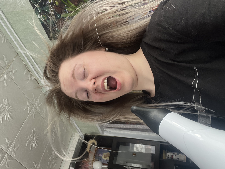 - "An individual with fair skin and blonde and brown hair is depicted indoors in Дойная, Russia, engaged in hair drying" by FM-gQbQG2, licensed under CC BY 4.0