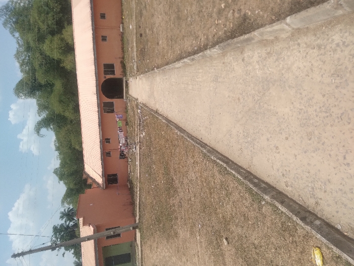This image captures an outdoor scene in Ipetumodu, Nigeria, featuring a single-story building under a partly cloudy sky. The structure displays light orange-peach colored walls and a light orange corrugated metal roof. A central concrete pathway, flanked by concrete curbs, leads directly to an arched entrance located in the primary section of the building. To the left, a smaller, connected section of the building features a wall painted green on its visible side. Multiple rectangular windows with dark frames are distributed across the building's facade. A clothesline with assorted colored laundry is visible hanging outside near one of the windows. The ground surrounding the pathway consists of dry, light brown earth with sparse vegetation. A wooden utility pole, showing a slight lean, stands in the mid-ground on the left, supporting overhead wires. Dense green foliage forms a backdrop behind the building. No individuals are present in the scene. A yellow wrapper lies on the dry ground to the left of the concrete path.