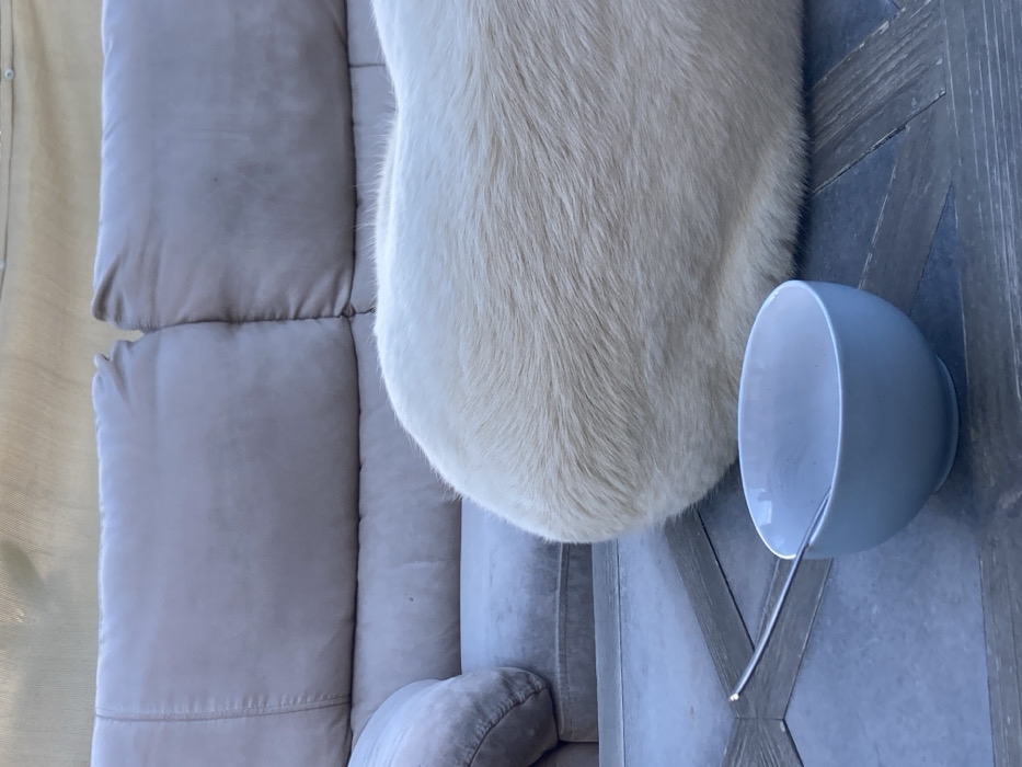 An outdoor scene in Herzliya, Israel, depicts a light-colored animal, identified as a dog, positioned with its back and flank visible on a dark-colored patterned outdoor table. A light blue ceramic bowl containing a silver spoon is located to the left of the animal on the same table. In the background, a light grey upholstered outdoor sofa is visible beneath a light-colored overhead cover or awning. No human subjects are present.