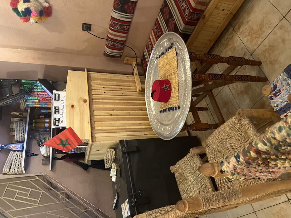 A room features Moroccan decor: seating with woven straw cushions and a wooden frame, a silver platter displaying a straw mat and red fez with a green star, and a wooden cabinet. A Moroccan flag is near a shelf stocked with drinks. Colorful cushions lean against the wall. The room appears to be a shop or restaurant.