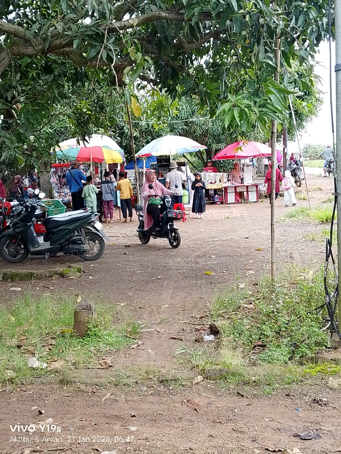 A dirt area is populated with people and vending stalls shaded by colorful umbrellas. Several people are walking and browsing, while one woman in a pink hijab rides a black electric scooter. A parked black motorcycle sits nearby. Lush green trees surround the area, casting shade over the scene. Tall grass and scattered debris are visible on the ground in the foreground.