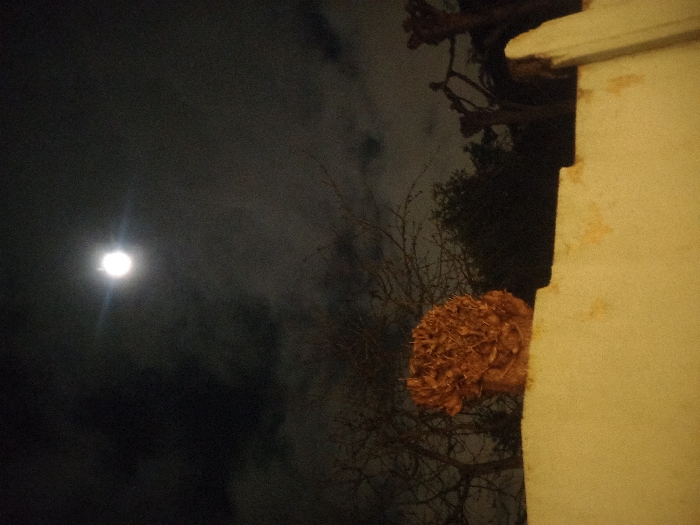 A nighttime scene shows a bright moon against a dark, cloudy sky. Silhouetted branches of a tree extend across the frame. To the right, a light-colored wall with a distinct edge is visible. Adjacent to the wall, within the tree branches, there's a textured, round object, possibly a bird's nest or a similar natural formation. The overall ambiance is dark and mysterious.