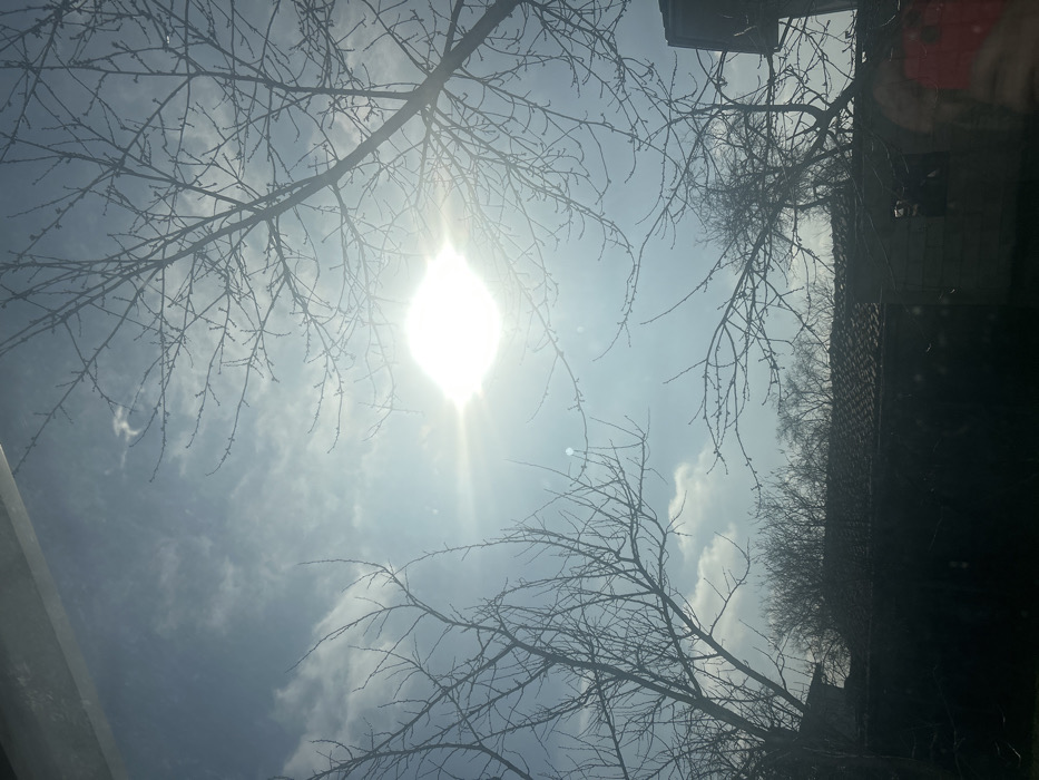 The image captures an outdoor scene in Priseltsi, Bulgaria, characterized by a bright, sunny sky and silhouetted vegetation and structures. The dominant feature is a brilliant, overexposed sun, centered in the upper-left quadrant, emitting significant lens flare across the blue sky which contains scattered, thin white clouds. Bare deciduous trees with intricate branch networks, devoid of foliage, are prominently silhouetted against the sky on the left, right, and lower-middle portions of the frame, suggesting a late winter or early spring season. In the lower half of the image, the upper sections of various buildings and structures are visible, largely cast in deep shadow due to the backlight. A structure with a reddish-brown tiled roof is identifiable in the lower-middle. To its right, a portion of another building with light-colored siding is discernible. The immediate foreground is dark and indistinct. A faint red reflection is present in the lower right corner, indicating the photograph may have been taken through a window or reflective surface. No individuals or specific actions are depicted.