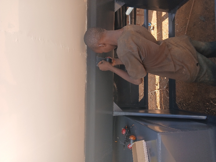 In an outdoor industrial setting in Unguwar Saya, Nigeria, a young male, viewed from his right side, works on a large metal structure