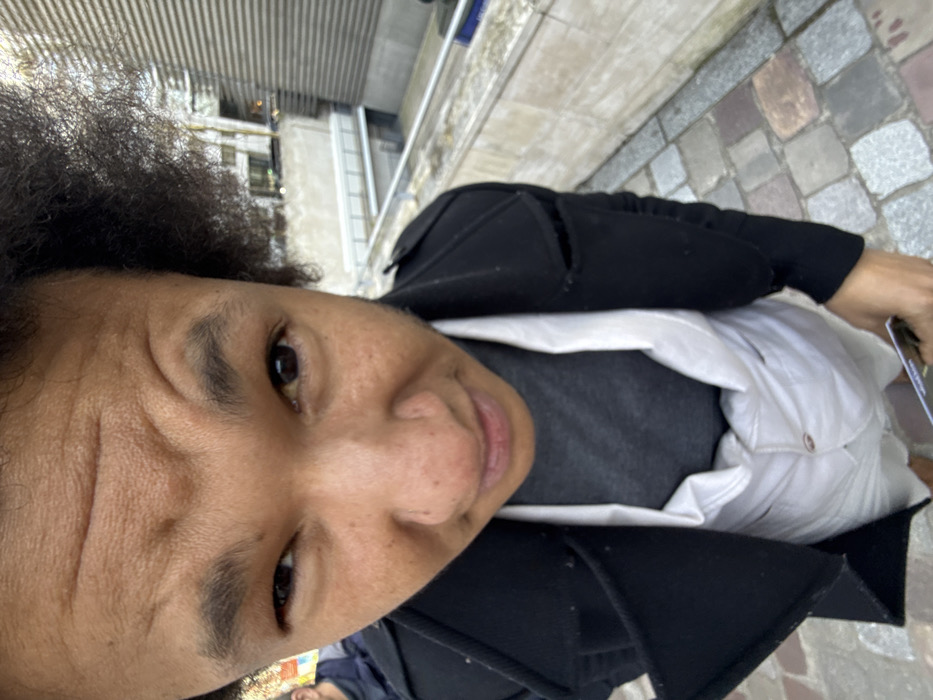 A person with dark, curly hair, medium-brown skin, and deep forehead wrinkles is depicted in a close-up, wide-angle shot, looking directly at the viewer. They are wearing a black peacoat over a dark grey garment, with a white, unbuttoned collared shirt and a white waistcoat visible underneath. Their right hand, in the lower right corner, holds a small, dark rectangular object, possibly a smartphone. The subject has some light facial hair on the chin. The scene is outdoors, on a cobblestone pavement composed of irregular grey and reddish-brown stones. Behind the individual, a light-colored concrete or stone wall serves as a barrier, below which a recessed urban structure is visible with lighter railings. In the background, modern buildings with ribbed or corrugated metallic facades are present, suggesting contemporary architecture. The architectural features and urban elements are consistent with the area around the Centre Pompidou, in the 4th arrondissement of Paris, France.