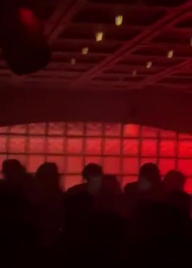 dimly lit nightclub or dance floor with a crowd of people dancing in silhouette. The lighting is primarily red, with moving spotlights occasionally flashing purple or pink. In the background is a wall made of glass blocks, illuminated in red. The ceiling is a textured grid pattern with recessed lighting. The camera angle is from the perspective of someone in the crowd, looking towards the back of the room. There's a large speaker visible hanging from the ceiling on the left side of the frame. The overall impression is of a crowded and energetic nightlife scene.